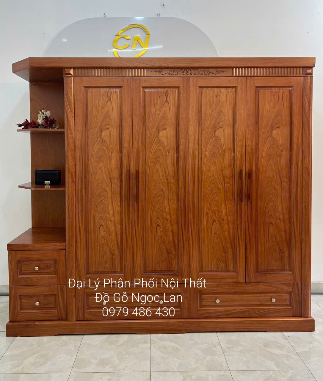 Tủ Quần Áo Gỗ Hương Đá 4 Cánh Kèm Kệ Trang Trí Vế Trái Tiện Nghi, Sang Trọng