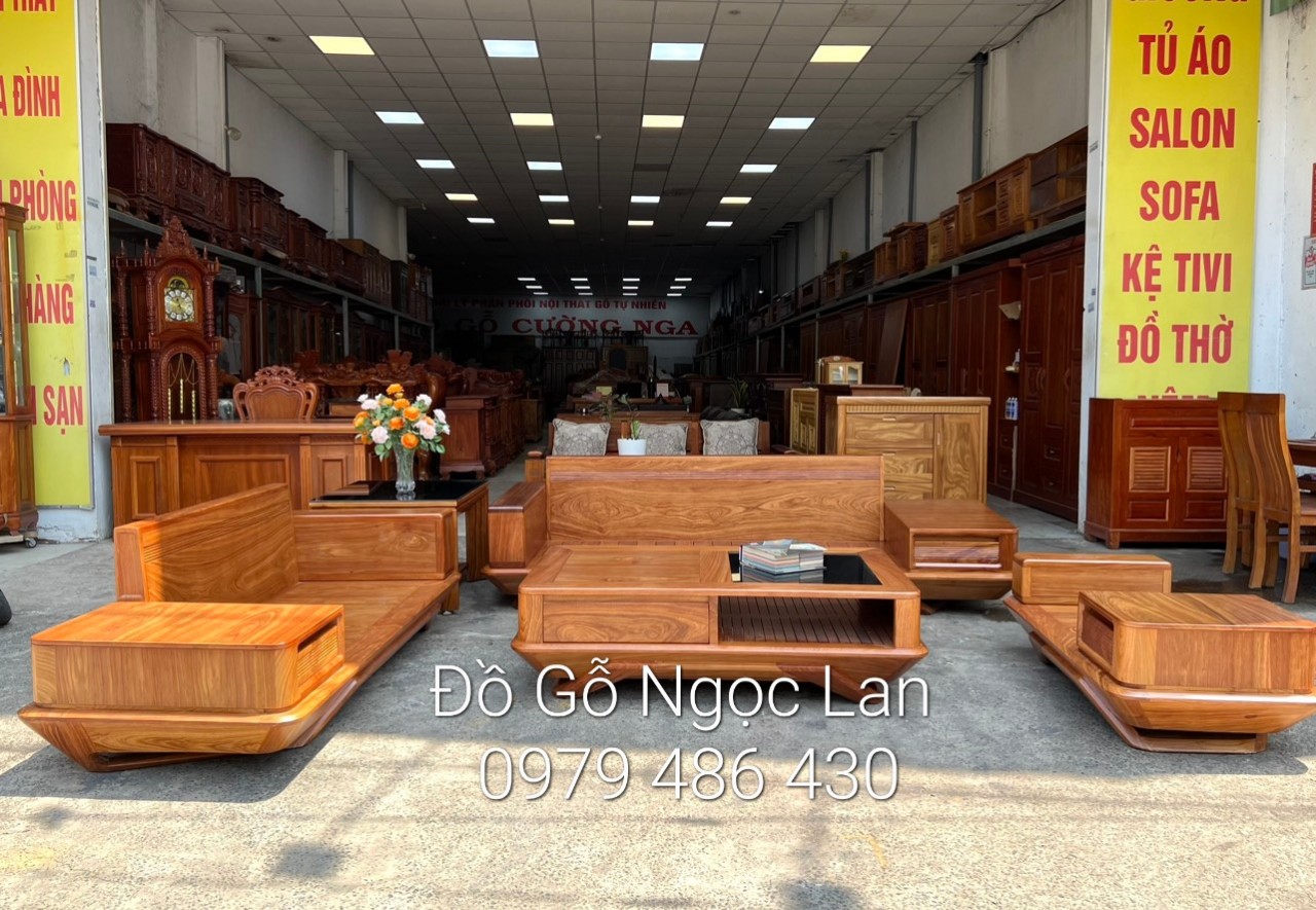 Bộ Bàn Ghế Phòng Khách Gỗ Sồi Nga Màu Óc Chó 2 Văng Chân Thuyền Hiện Đại