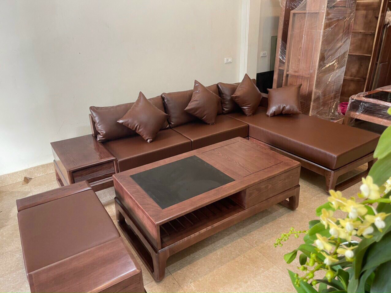 Bàn ghế sofa gỗ sồi nga góc L hiện đại 2m8x1m8 - nệm da