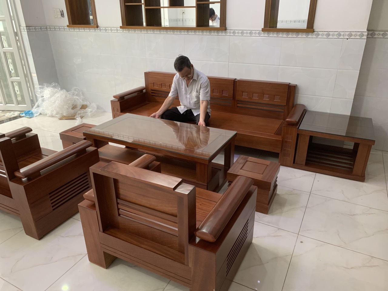 Bộ Bàn Ghế Phòng Khách Gỗ Sồi Nga Màu Óc Chó 2 Văng Chân Thuyền Hiện Đại