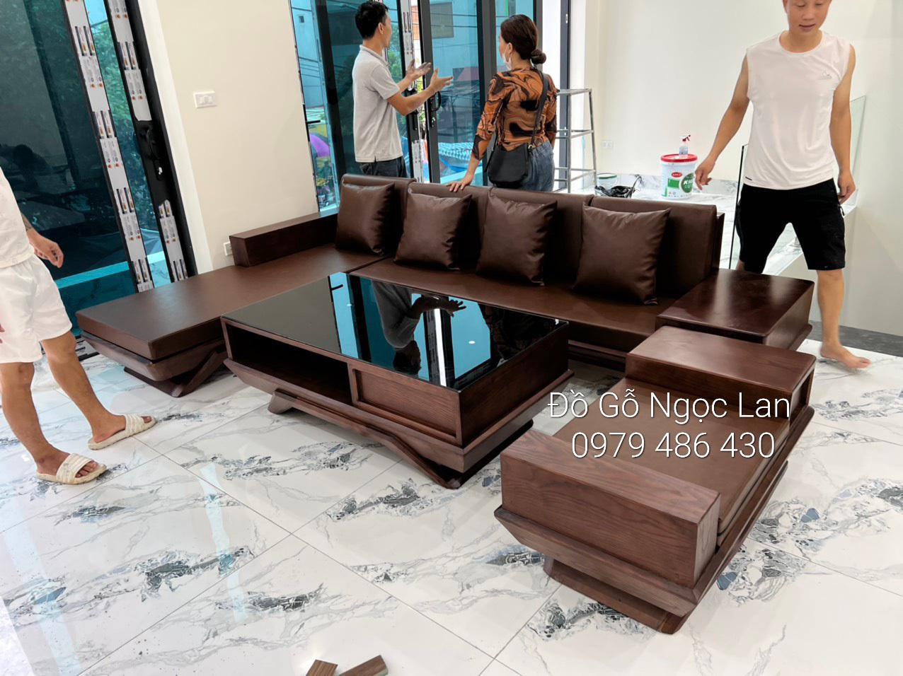 Sofa gỗ tự nhiên góc chân thuyền gỗ sồi nga lau màu óc chó kèm nệm