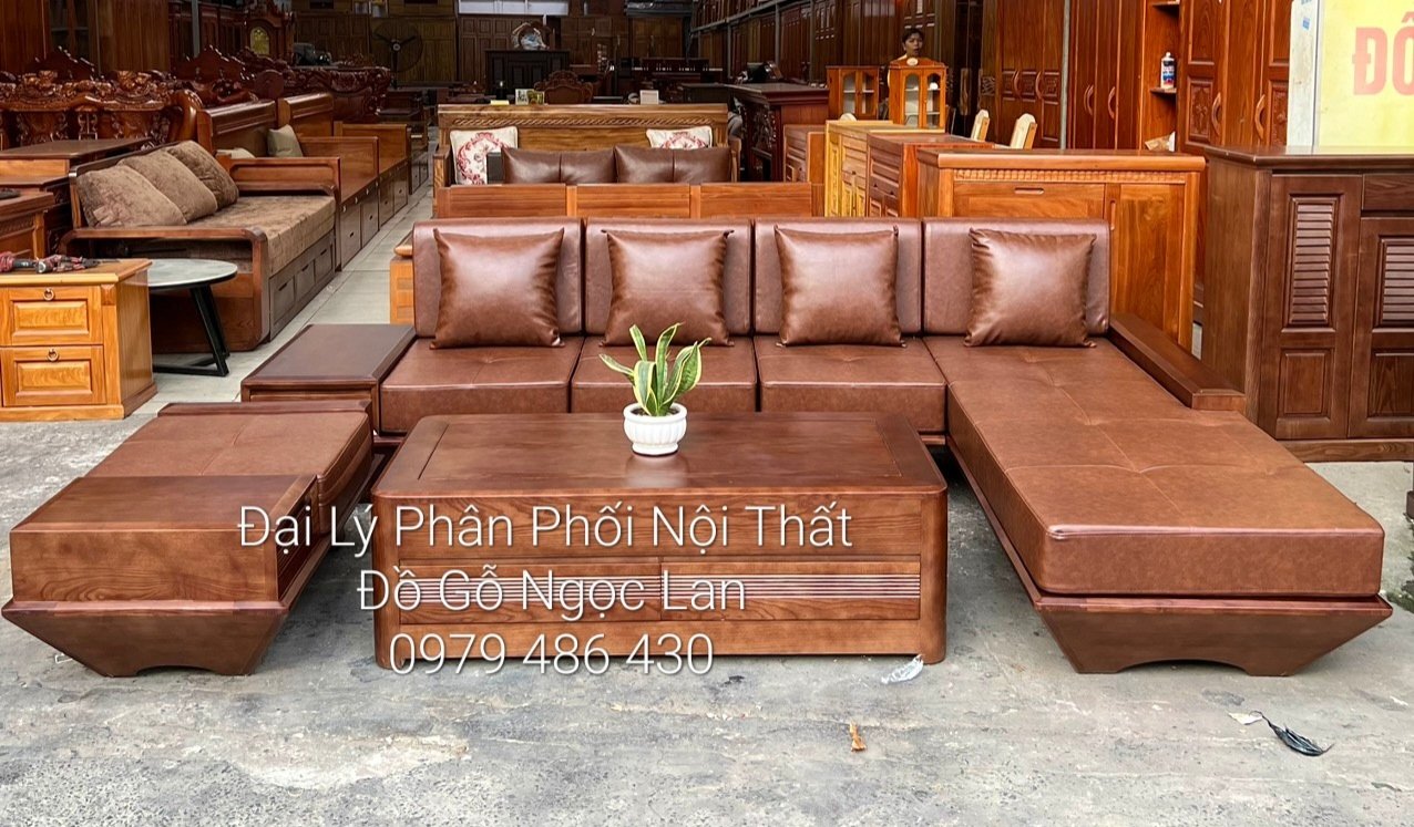 Sự kết hợp hài hòa giãu gỗ sồi tự nhiên màu nâu óc chó và đệm da màu nâu tạo nên vẻ đẹp sang trọng và bề thế cho không gian phòng khách của bạn .Bộ sofa góc chữ L này không chỉ là nơi thư giãn lú tưởng mà còn là điểm nhấn độc đáo trong căn phòng của bạn
