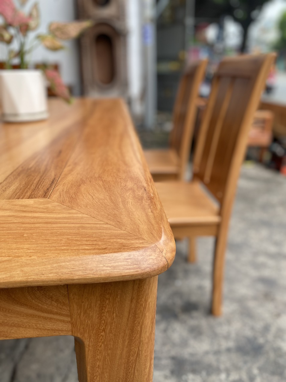 Bộ bàn ăn 6 ghế gỗ gõ đỏ hình chữ nhật được nhiều gia chủ quan tâm nhất. Diện tích của các căn hộ ngày nay khá chật hẹp, nhất là nhà phố thường hẹp ngang. Bởi vậy, các bộ bàn ghế hình tròn sẽ chiếm nhiều diện tích phòng bếp. Trong khi đó, các bộ bàn ăn hình chữ nhật lại gọn gàng hơn và có thể bài trí ở nhiều vị trí trong nhà.