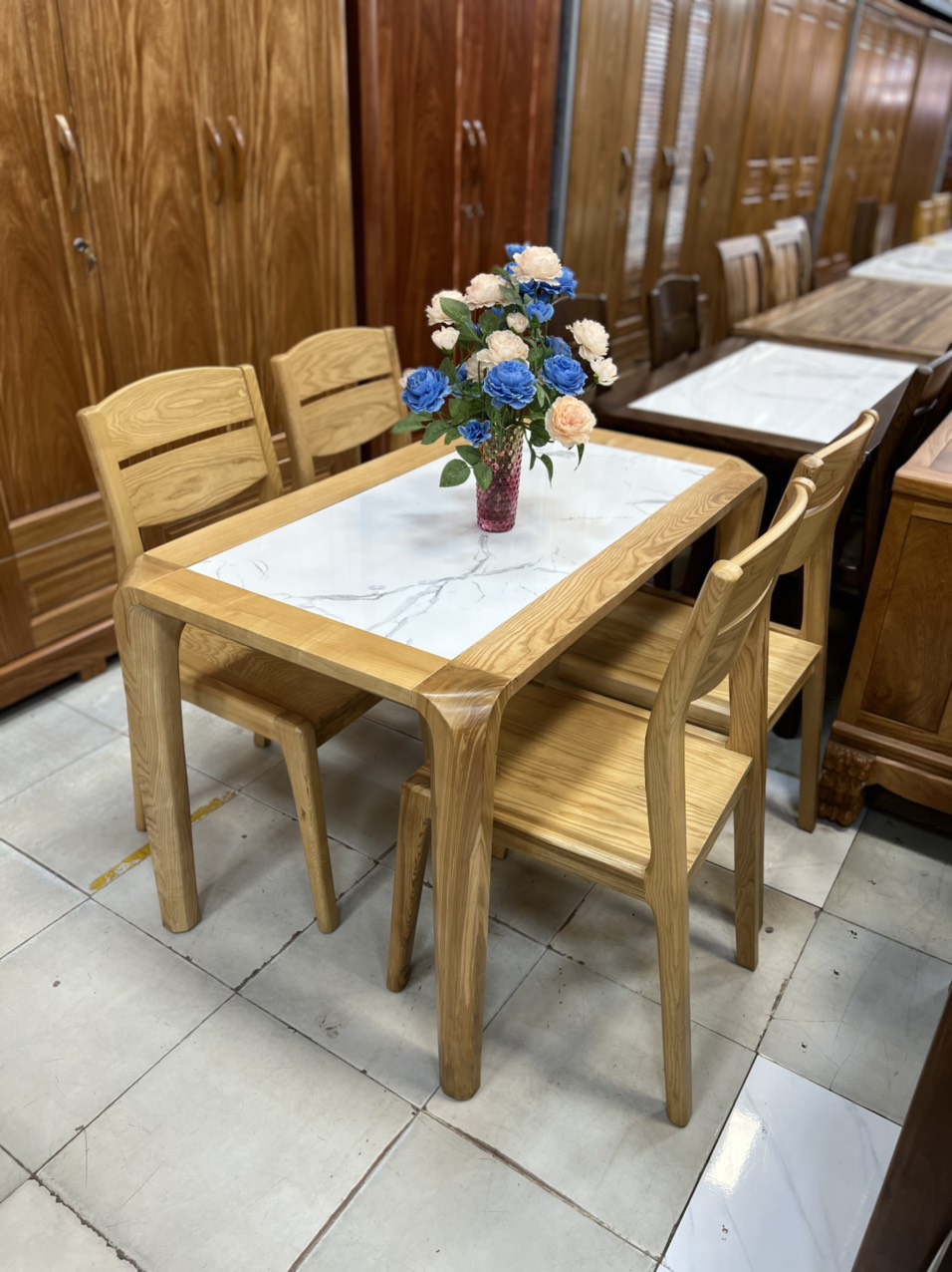 bộ bàn ăn gỗ sồi mặt đá 4 ghế hàng đẹp BA GS 07
