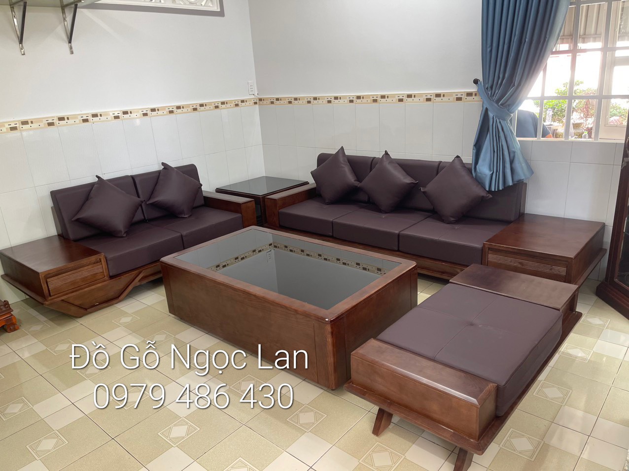 Sofa gỗ sồi sơn màu óc chó sang trọng và tinh tế cho phòng khách