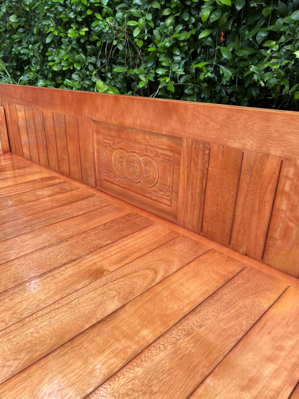 Ghế giường được trang trí với họa tiết hoa lá nhỏ, sản phẩm thêm phần đẹp mắt và tăng thêm tính sang trọng, thẩm mỹ cho không gian phòng ở. Đồ gỗ, nhất là trường kỷ, được coi như là vật phẩm phong thủy cho mỗi gia đình. Giúp hút sinh khí, mang lại may mắn, sức khỏe cho cả gia đình.