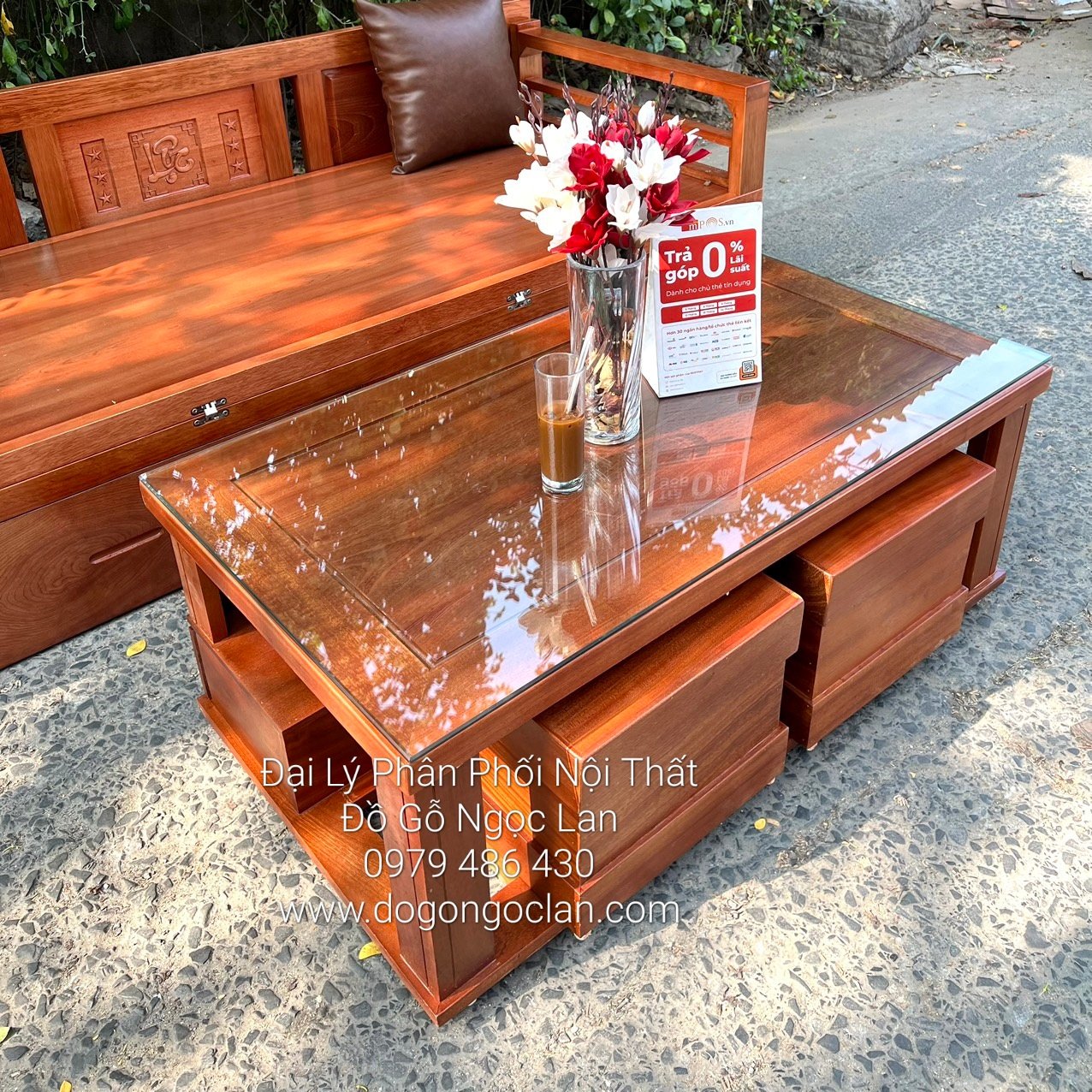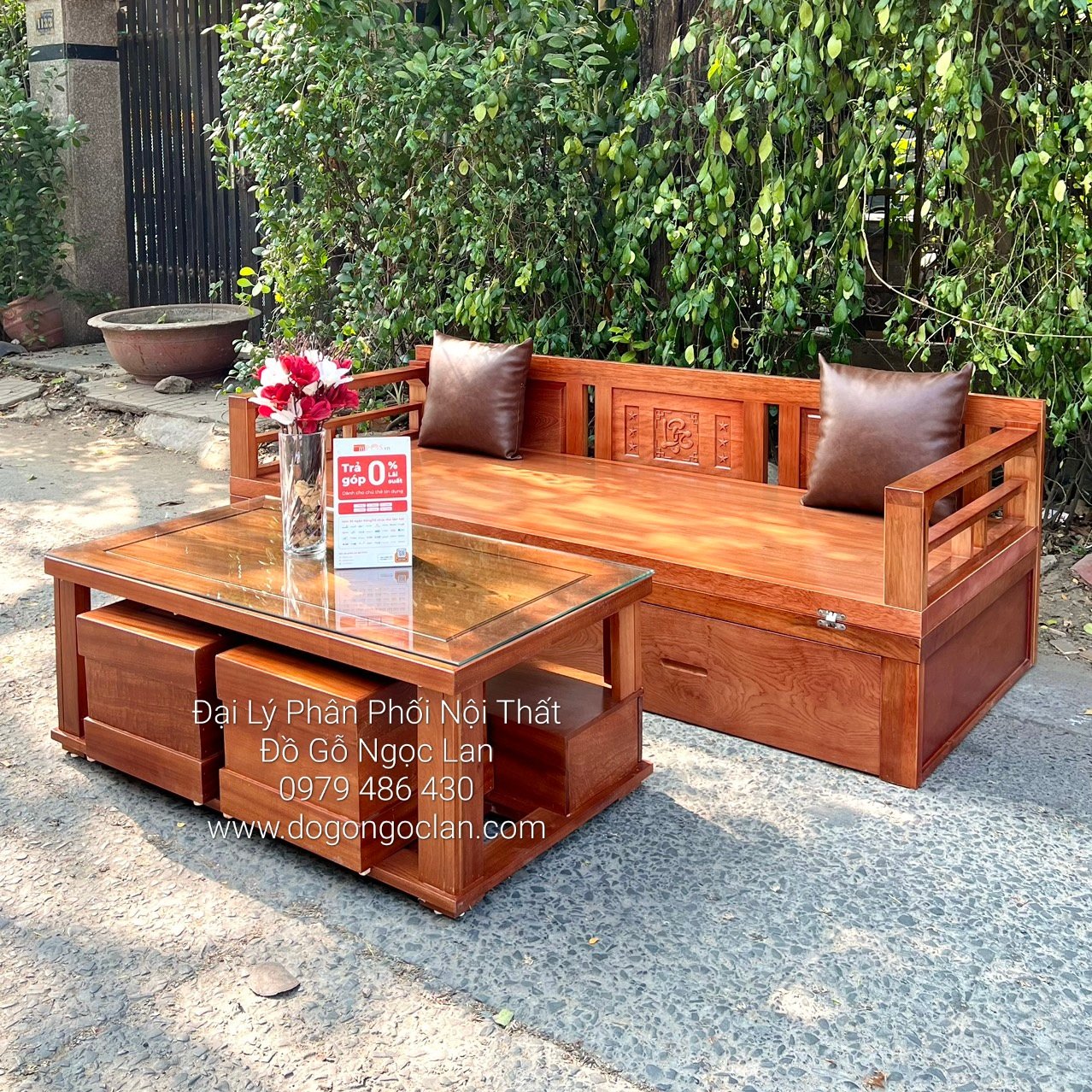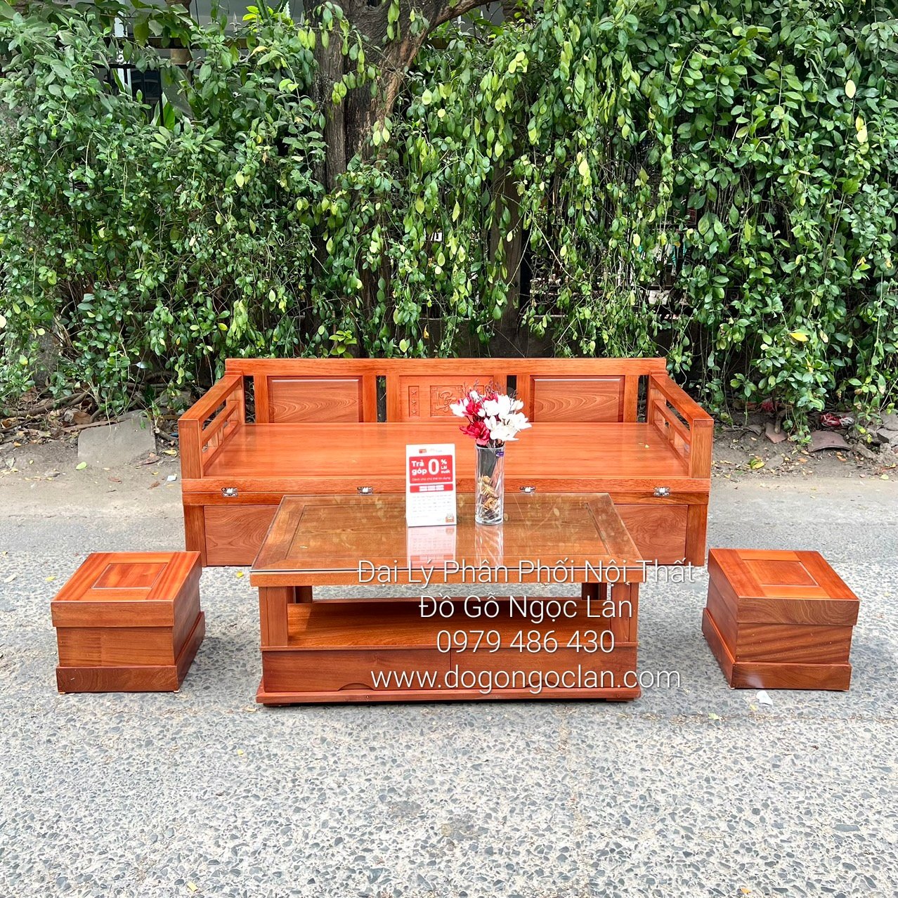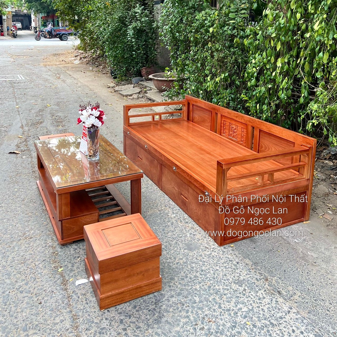 Kích thước giường ghế gỗ xoan đào + bàn trà gỗ 4 món