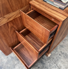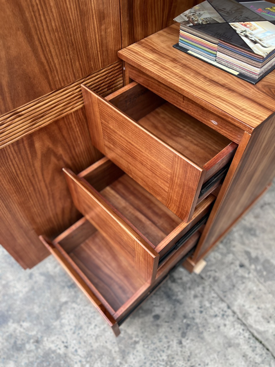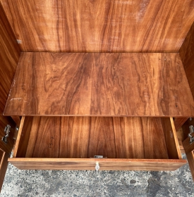 Tủ quần áo gỗ Cẩm 3 cánh 2 tầng kèm kệ trang trí có thiết kế nội thất khá tiện nghi , tạo không gian tối đa giúp gia chủ thoải mái đựng nhiều quần áo và vật dụng cá nhân. Các chi tiết kệ tủ, giá treo đều được làm từ gỗ Cẩm và kết nối với khung tủ bằng các loại ốc vít chất lượng và keo dán chuyên dụng vô cùng chắc chắn, do vậy quý khách sẽ luôn yên tâm treo và đựng nhiều quần áo mà không phải lo lắng kệ tủ hay giá treo bị trũng hay giảm chất lượng sau nhiều năm.